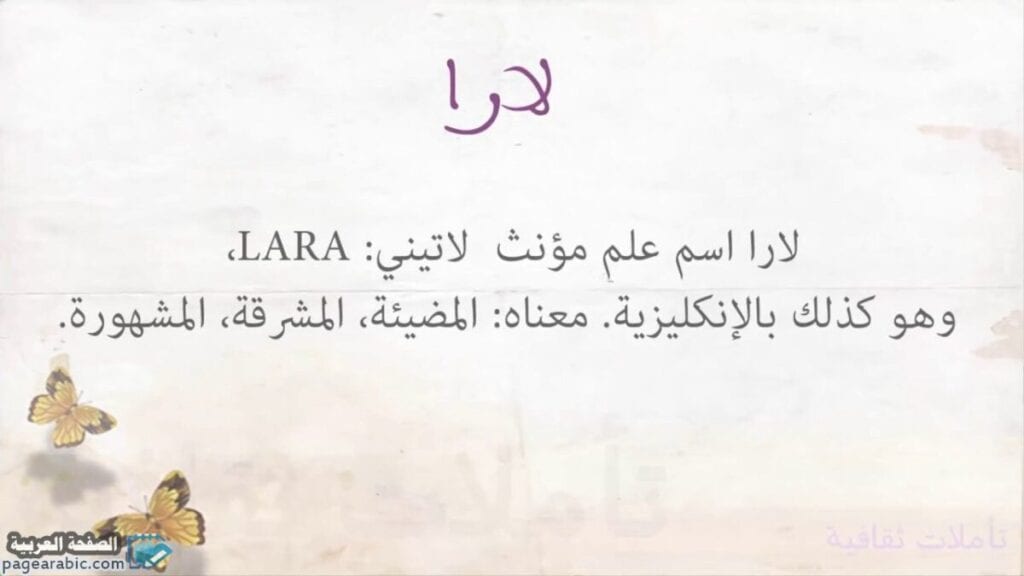 معنى اسم لاراName of Lara في المعجم العربي نتعرف سوياً متابعينا الكرام حول اصل اسم لارا وماهي صفات اسم لارا وهل اسم لارا من الأسماء الجائزة التسمية بها ؟!.