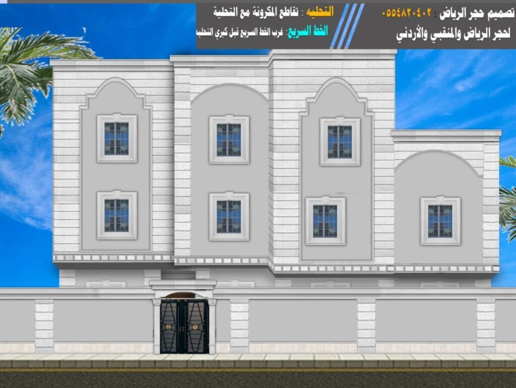 من خالل التصميم التالي يظهر لنا تصميم حجر الرياض الأبيض بشكل بسيط وتركيب فقط الديكورات الخاصة بالبناء, وتعتمد هذه الطريقة بشكل كبير على إدخال الحجر الأبيض في جوانب وحواف الفلل او العمارة لإعطاء مظهر, ويسود بقية الابناء الكرافيتو او مادة لونية اخرى.