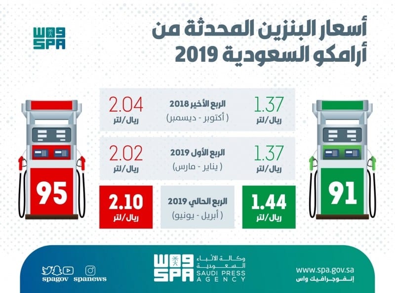 (بنزين 91: 1.44 ريال لكل لتر)، و(بنزين 95: 2.10 ريال لكل لتر)، وذلك خلال الربع الحالي إبريل ـ يونيو 2019م.