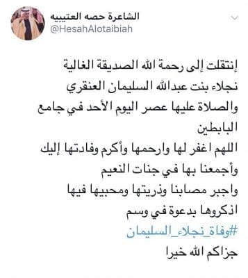 نشرت الشاعرة السعودية حصة العتيبية منشور طالبت متابعيها بالدعاء لصديقتها نجلاء السليمان والتي توفت ودفنت الى مثواها الأخير اليوم الأحد.