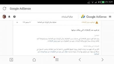 1. وصلت رسالة تقييد تقييد الإعلانات وتم وقفها اسبوع وبقيت الرسالة لكن يتم عرض الإعلانات بشكل طبيعي
