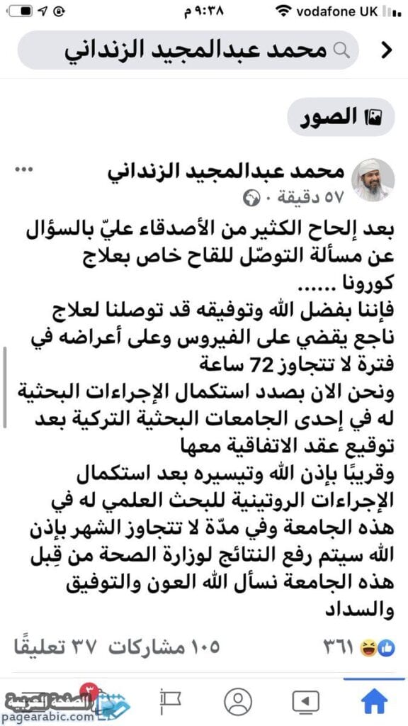 أعلن الشيخ محمد الزنداني من خلال حسابه الرسمي على الفيس بوك عن توصله وإكتشافه للقاح يقضي على فيروس كورونا والذي ضرب العالم وجعل العالم تعيش في رعب حقيقي بسبب هذا المرض الخبيث الذي قضى على العديد من البشر وأصاب الكثيرون.