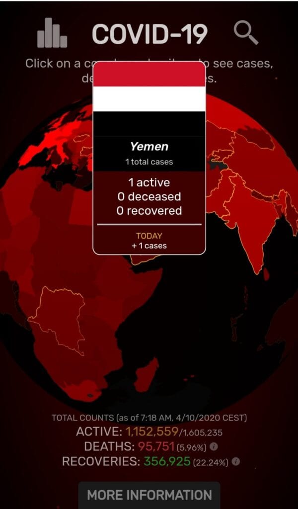 عدد حالات كورونا في اليمن وذلك بعد الإعلان عن تسجيل أول إصابة بفيروس كورونا 10 ابريل 2020 في محافظة حضرموت اليمنية وهنا سوف نضع لكم عدد الحالات المصابة بالفيروس وكذلك عدد الوفيات وحالات الشفاء ونسأل الله أن تكون هي الحالة الوحيدة.