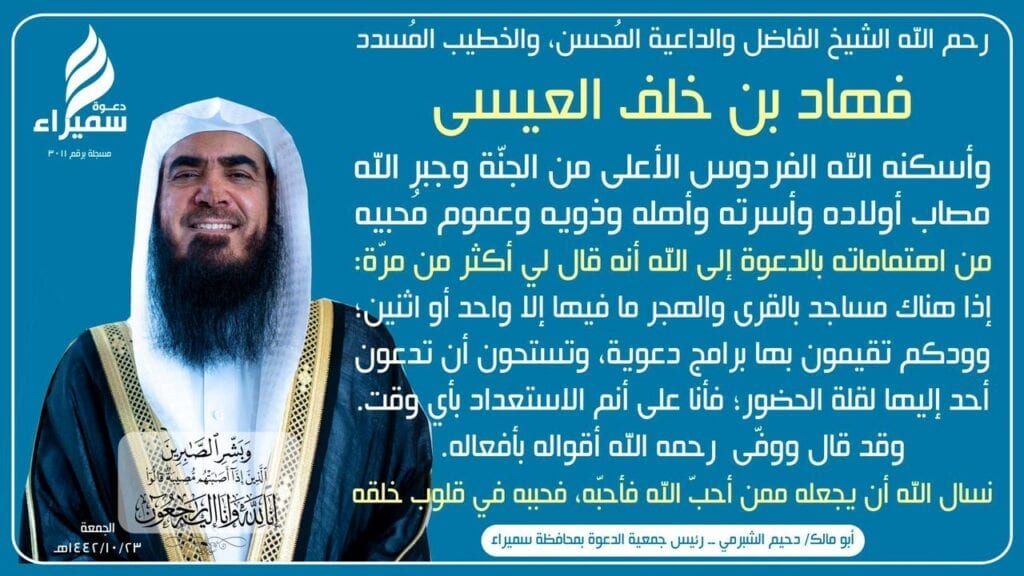 تتقدم الصفحة العربية في تعزية في وفاة الداعية الشيخ فهاد العيسى في الساعات الأولى من يوم الجمعة الموافق 4 يونيو 2021 حيث تم تشييع جنازة العيسى اليوم الجمعة في مقبرة صديان.