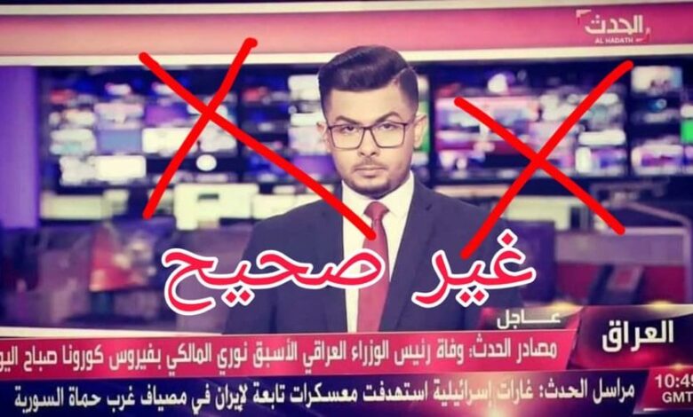 قامت بعض الصفحات وبعض المواقع بنشر خبر وفاة نوري المالكي رئيس الوزراء العراقي السابق وذلك من خلال نشر خبر وصورة مزيفة من خلال قناة العربية الحدث حيث تم تزوير خبر عبر شريط الأخبار في القناة.