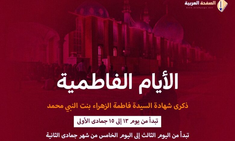الأيام الفاطمية الثالثة تاريخ وفاة الزهراء عند الشيعة روايات استشهاد الزهراء استشهاد فاطمة الزهراء الرواية الثانية استشهاد فاطمة الزهراء الرواية الأولى تاريخ وفاة فاطمة الزهراء بالميلادي تاريخ وفاة فاطمة الزهراء بالهجري متى يصادف وفاة فاطمة الزهراء 2024