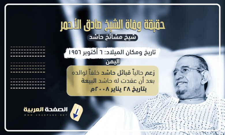 وفاة صادق الأحمر من خلال مقالنا اليوم سوف نتعرف على معلومات عبر ويكيبيديا وبعض المواقع الأخرى حول السيرة الذاتية وكذلك حقيقة مقتل الشيخ صادق الأحمر والذي تم تداول بعض الصفحات عبر مواقع التواصل الإجتماعي تويتر وكذلك فيس بوك حول خبر وفاة صادق الأحمر من خلال موقعنا الصفحة العربية .