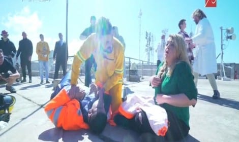 وأثناء الحوار يشتعل حريق صغير سريعًا ما يكبر، ويتدخل رجل الإنقاذ الذي يرتدي ملابسه رامز جلال لإخراج النجم لسطح المبنى الشاهق، وفي الطريق لسطح المبنى يتم مفاجأة النجم بحرائق وانفجارات قوية، حتى يصل للسطح.