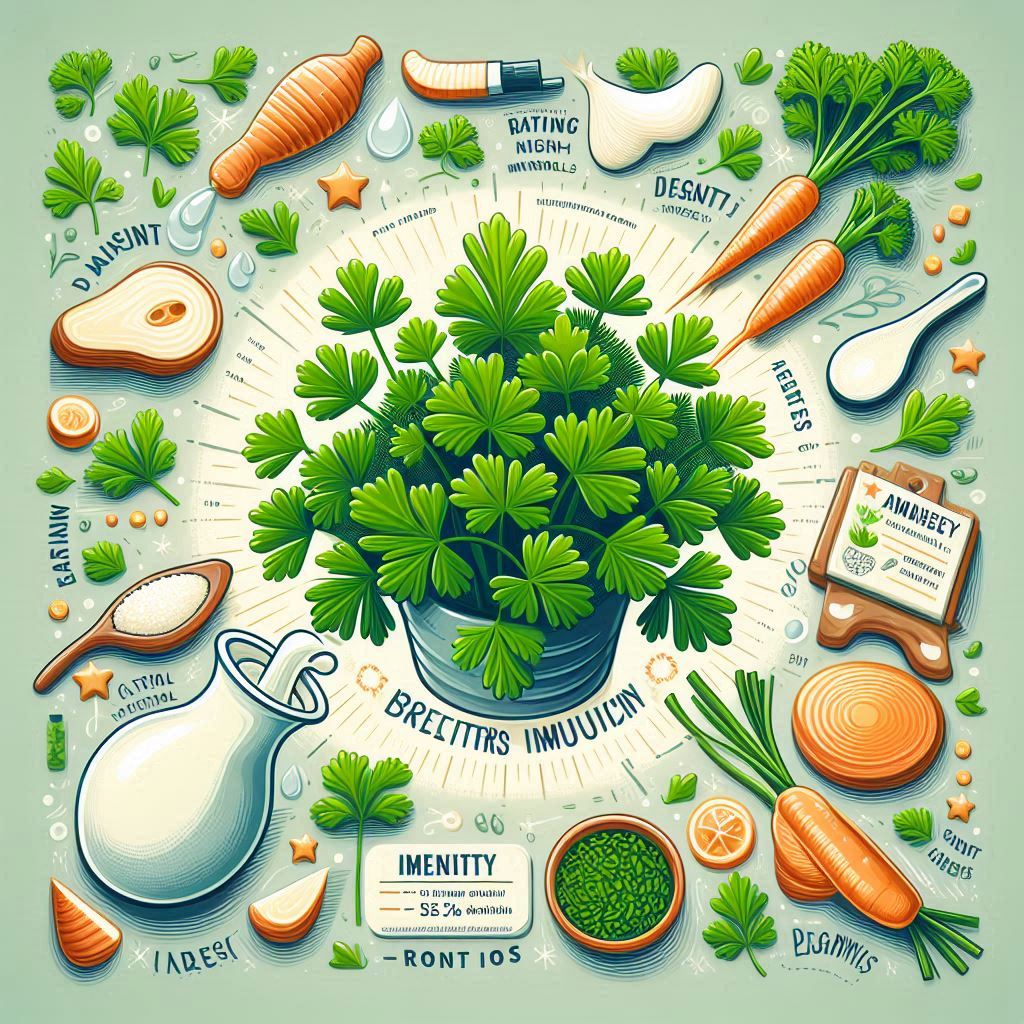 إن الفيتامينات والمعادن ، ومضادات الأكسدة الموجودة في البقدونس هي مفيدة لتعزيز المناعة. كما ويحتوي على الفيتامينات التالية : فيتامين C، فيتامين A، فيتامين K، حمض الفوليك، والنياسين . فيتامين (أ) يعمل مباشرة على الخلايا الليمفاوية أو خلايا الدم البيضاء، وبالتالي زيادة تأثيرها. و الكلوروفيل الموجود في البقدونس يحتوي على خصائص مضادة للبكتيريا ومضادة للفطريات . قد أظهرت بعض الدراسات أن البقدونس يحتوي على خصائص مضادة للأكسدة وخصائص مضادة للجراثيم، مما يجعلها مصدرا مثاليا لمختلف العلاجات المنزلية.