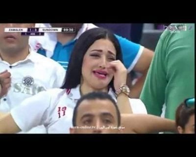 صورة اخرى من صور دنيا الحلو وهيا في مدرجات المعلب تشارك مشجعي نادي الزمالك وتظهر عليها البكاء بسبب بعض الأخطاء او الفرص الضائعة لنادي الزمالك.