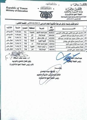 أسماء أوائل الثانوية العامة اليمن 2016 , اسماء اوائل ثالث ثانوي علمي ادبي نتائج الثانوية اليمن 2016