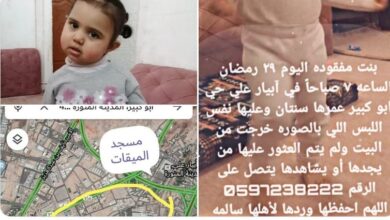 مفقودة المدينة الطفلة مسك التي فُقدت اليوم في المدينة المنورة في المملكة العربية السعودية اليوم الجمعة الموافق 22 مايو 2020…